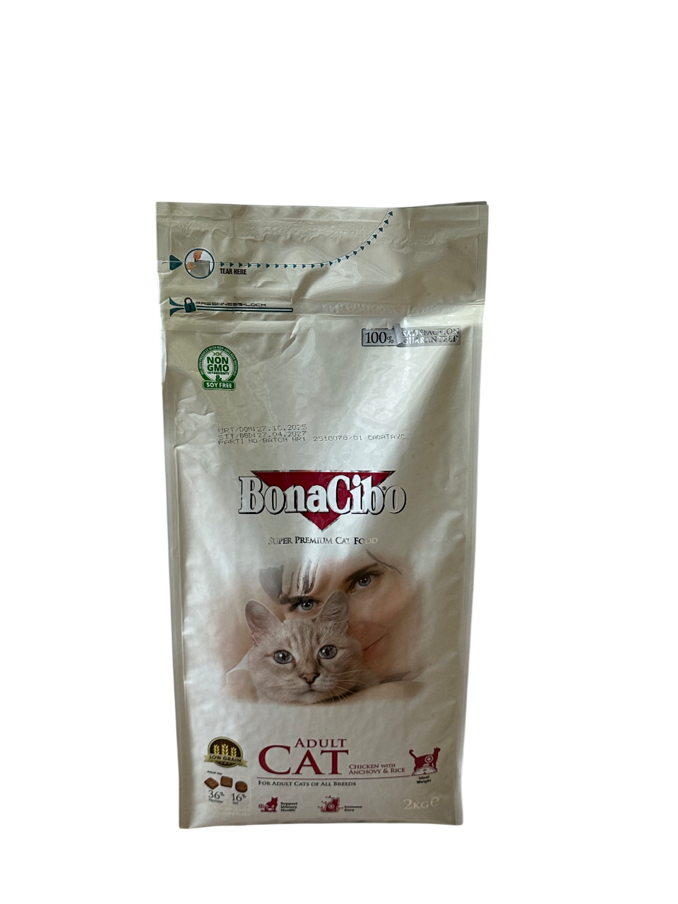 Bonacibo super premium hrana za odrasle mačke piletina i pirinač sa inćunima 2kg je kvalitetna ekstrudirana suva hrana za odrasle mačke, sada dostupna i u praktičnom pakovanju od 2 kg – idealno za vlasnike sa jednom mačkom ili za testiranje nove hrane.
