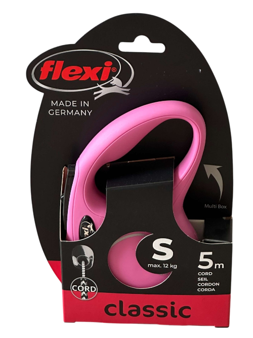 Flexi New Classic S Cord 5m u roze boji je praktičan, lagan i moderan automatski povodac namenjen malim psima i ljubimcima do 12 kg.