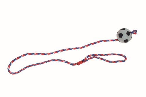 Gumena loptica sa kanapom za pse ili lopta od penaste gume u fudbalskom izgledu.