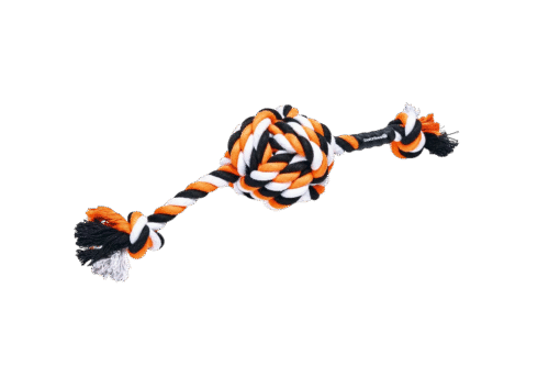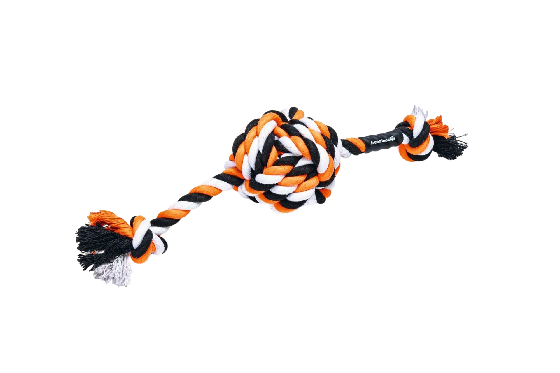 Ova kombinovana igračka od čvrstog pamučnog užeta i gusto upletene lopte omogućava višestruku zabavu – od potezanja i bacanja do samostalnog žvakanja.