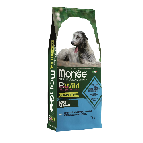 Monge Bwild Grain Free Adult Dog formula sa inćunom, krompirom i graškom osmišljena je da zadovolji nutritivne potrebe pasa svih rasa, posebno onih sa osetljivim sistemom varenja ili intolerancijom na žitarice.