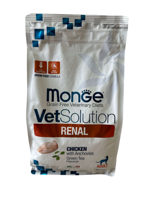 Monge VetSolution Renal Cat Grain Free Adult Chicken with Anchovies 1.5 kg je kompletna veterinarska dijetalna hrana za odrasle mačke, specijalno formulisana za podršku funkciji bubrega kod hronične ili privremene bubrežne insuficijencije. Ova napredna grain free formula sa smanjenim nivoom fosfora i pažljivo kontrolisanim proteinima pomaže u smanjenju opterećenja bubrega, očuvanju njihove funkcije i poboljšanju kvaliteta života mačke.